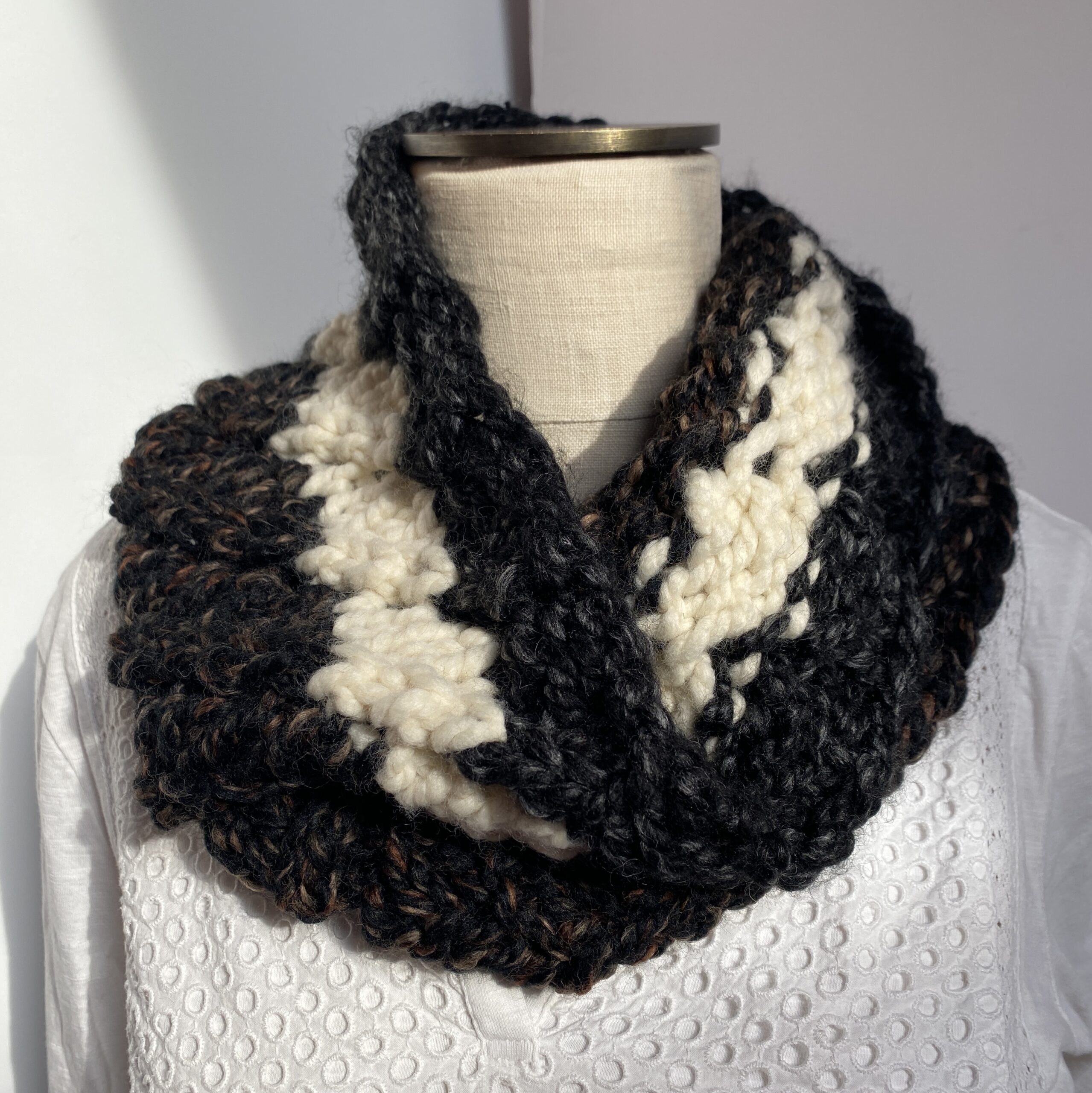 This stylish hand-knit cowl features a rich combination of brown and black yarns, beautifully accented with a subtle cream detail. Its versatile color palette makes it a perfect accessory to complement a variety of outfits, adding both warmth and sophistication to your look.