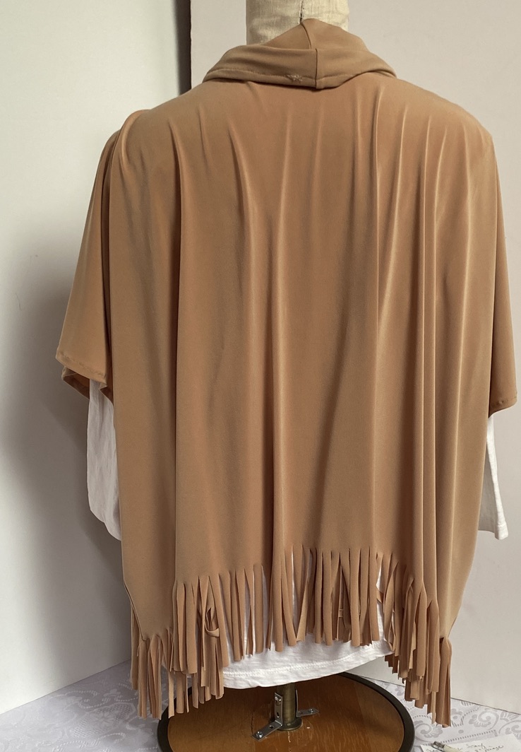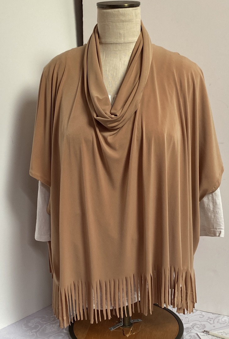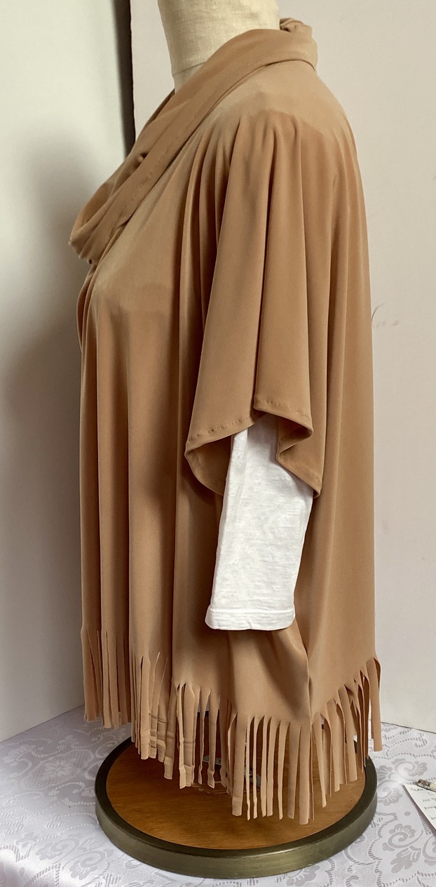 The tunic is accented with a 4-inch fringe along the hemline, adding a playful touch and dynamic movement to your look. A cowl collar enhances the overall elegance and provides a polished finish. Crafted in a high-quality ITY (Interlock Twist Yarn) knit fabric, this piece offers a soft, smooth feel and excellent drape.